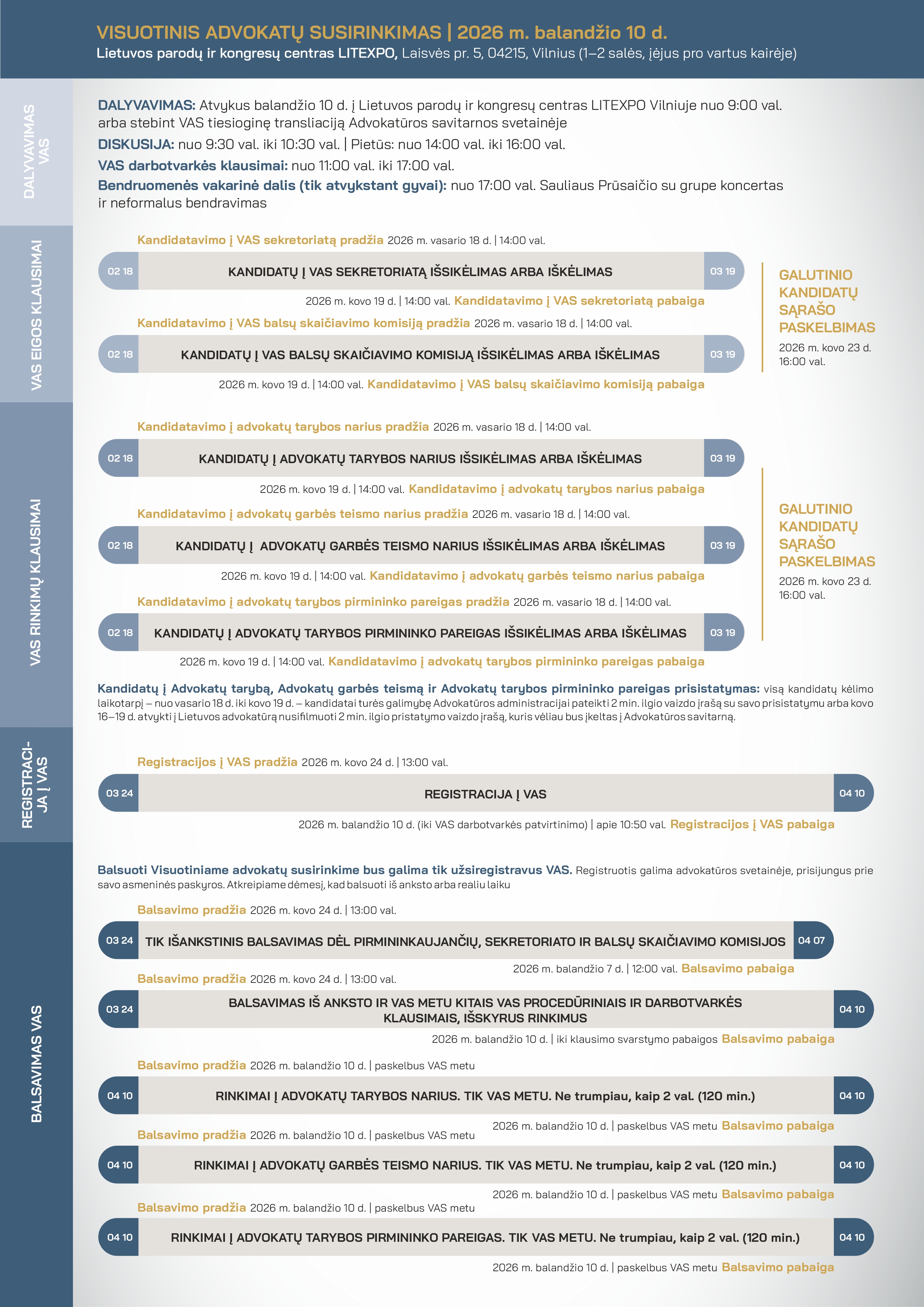 Informacija dėl Visuotinių advokatų susirinkimo registravimosi, balsavimo ir eigos datų: