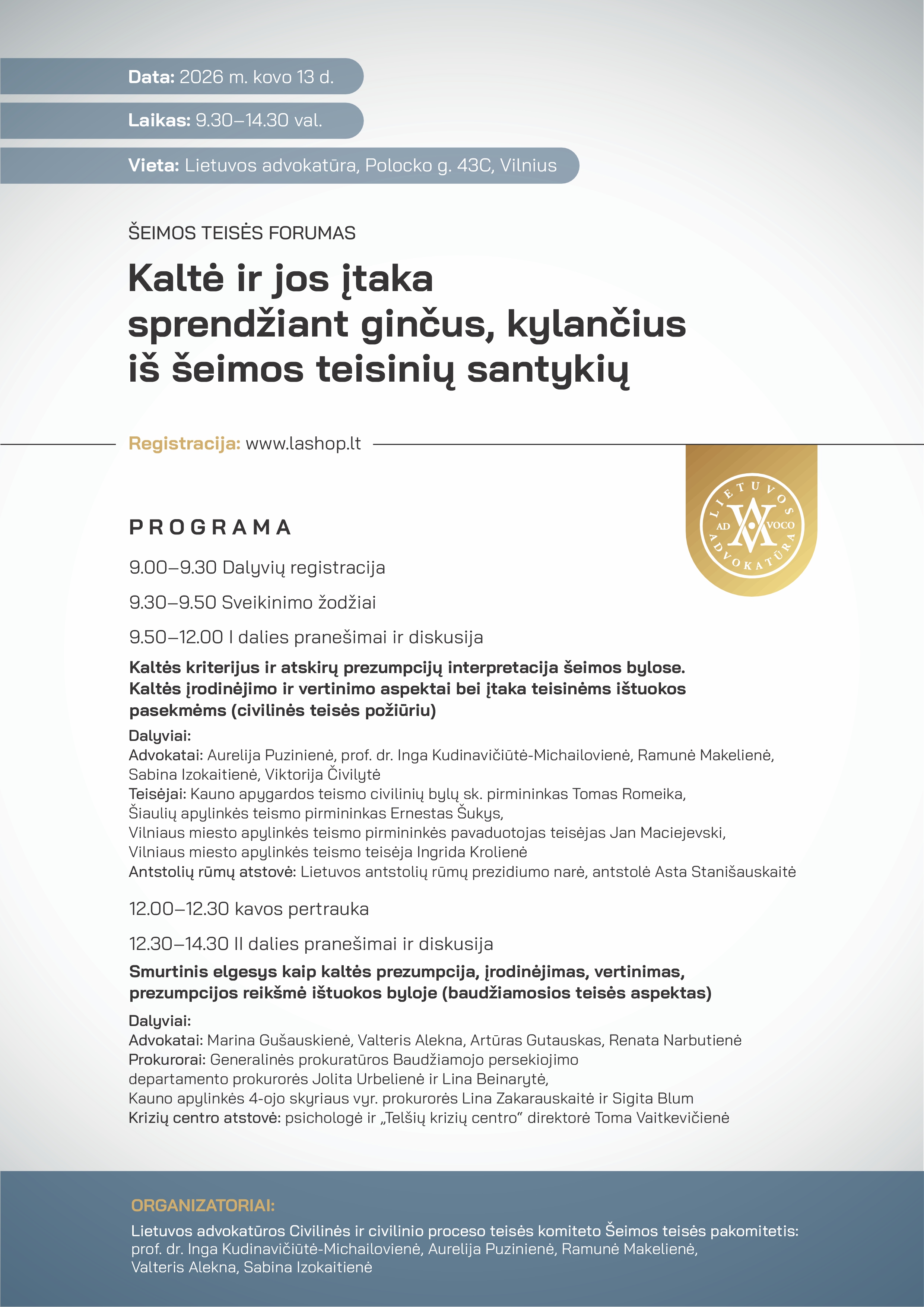 Šiandien, kovo 13 dieną, Advokatų namuose vyks Šeimos teisės forumas "Kaltė ir jos įtaka sprendžiant ginčus, kylančius iš šeimos teisinių santykių".
