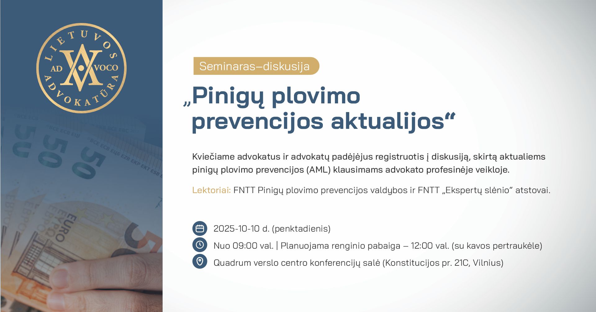 Kviečiame advokatus ir advokatų padėjėjus registruotis į diskusiją, skirtą aktualiems pinigų plovimo prevencijos (AML) klausimams advokato profesinėje veikloje.